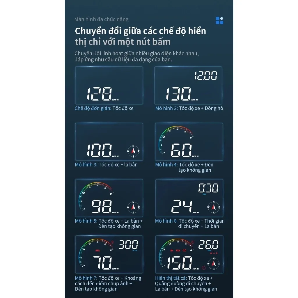 - Chế độ làm việc: OBD2 mode/GPS mode (tự chọn) – tương thích hầu hết xe đời hỗ trợ OBD2; nếu xe không hỗ trợ OBD, bật GPS để hiển thị tốc độ.